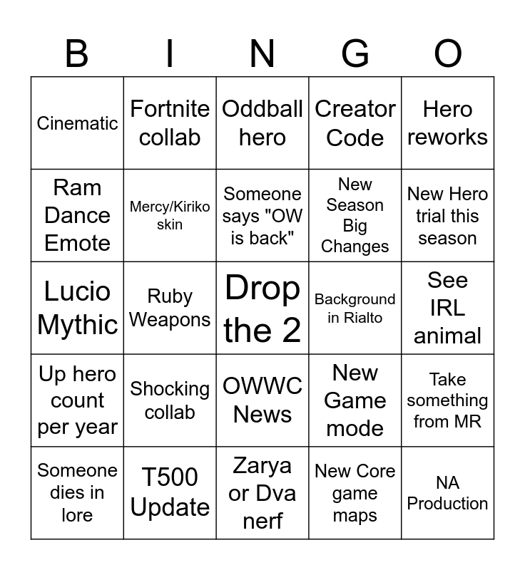 This bingo card has a free space and 24 words: Shocking collab, T500 Update, Someone says "OW is back", Someone dies in lore, Hero reworks, Cinematic, Ram Dance Emote, Fortnite collab, Background in Rialto, OWWC News, New Season Big Changes, Lucio Mythic, New Game mode, Take something from MR, Mercy/Kiriko skin, New Core game maps, See IRL animal, Oddball hero, New Hero trial this season, Ruby Weapons, NA Production, Up hero count per year, Creator Code and Zarya or Dva nerf.