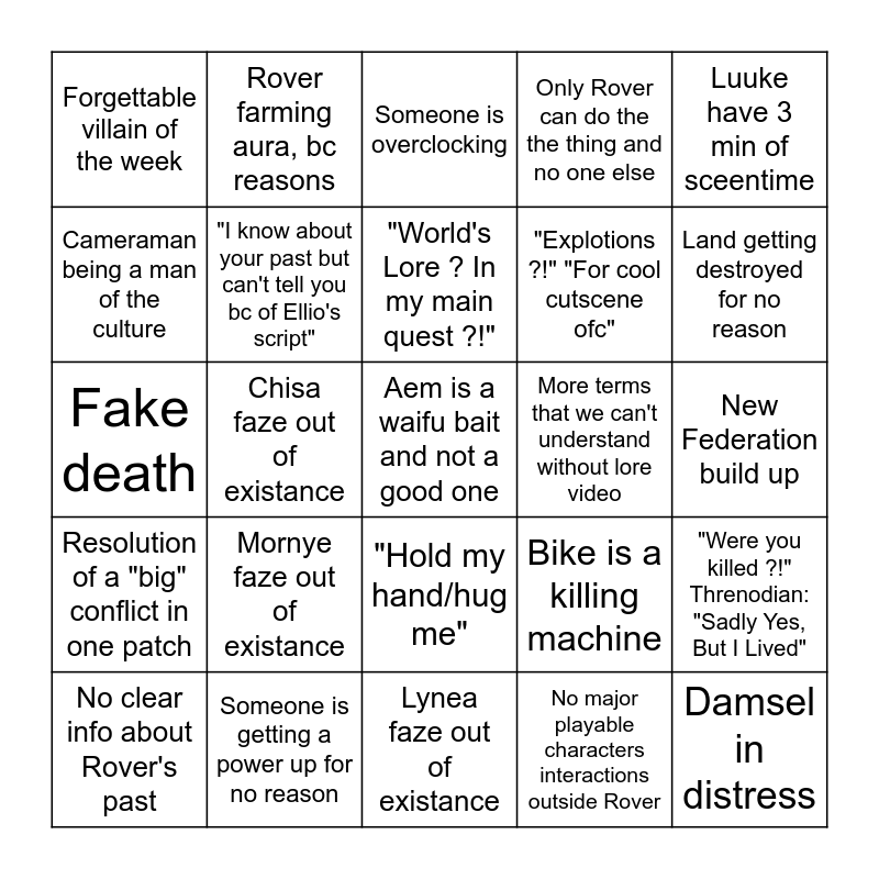 This bingo card has a free space and 24 words: Mornye faze out of existance, Someone is getting a power up for no reason, "World's Lore ? In my main quest ?!", No clear info about Rover's past, Luuke have 3 min of sceentime, Forgettable villain of the week, Cameraman being a man of the culture, Rover farming aura, bc reasons, More terms that we can't understand without lore video, "Hold my hand/hug me", "Explotions ?!" "For cool cutscene ofc", Fake death, Bike is a killing machine, "Were you killed ?!" Threnodian: "Sadly Yes, But I Lived", "I know about your past but can't tell you bc of Ellio's script", No major playable characters interactions outside Rover, New Federation build up, Someone is overclocking, Land getting destroyed for no reason, Chisa faze out of existance, Damsel in distress, Resolution of a "big" conflict in one patch, Only Rover can do the the thing and no one else and Lynea faze out of existance.