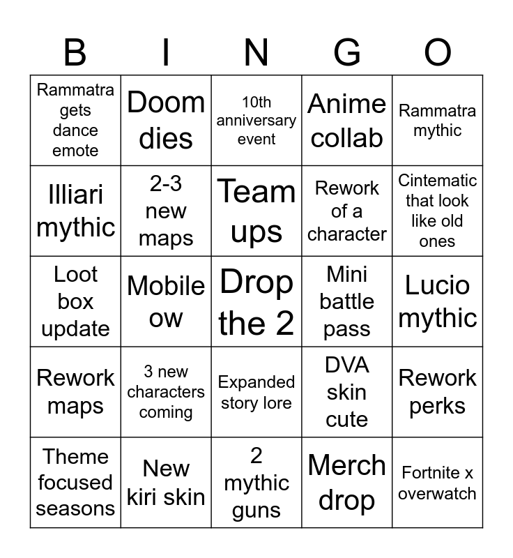 This bingo card has a free space and 24 words: 3 new characters coming, New kiri skin, Team ups, Theme focused seasons, Rammatra mythic, Rammatra gets dance emote, Illiari mythic, Doom dies, Mini battle pass, Expanded story lore, Rework of a character, Loot box update, DVA skin cute, Rework perks, 2-3 new maps, Merch drop, Lucio mythic, 10th anniversary event, Cintematic that look like old ones, Mobile ow, Fortnite x overwatch, Rework maps, Anime collab and 2 mythic guns.