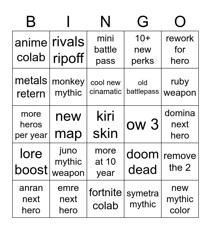 This bingo card has a free space and 24 words: juno mythic weapon, emre next hero, cool new cinamatic, anran next hero, rework for hero, anime colab, metals retern, rivals ripoff, ow 3, more at 10 year, old battlepass, more heros per year, doom dead, remove the 2, monkey mythic, symetra mythic, domina next hero, mini battle pass, ruby weapon, new map, new mythic color, lore boost, 10+ new perks and fortnite colab.