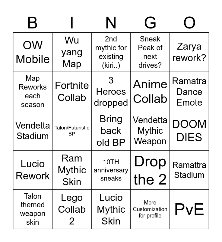 This bingo card has 25 words: Ram Mythic Skin, Lucio Mythic Skin, 3 Heroes dropped, Talon themed weapon skin, Zarya rework?, OW Mobile, Map Reworks each season, Wu yang Map, Vendetta Mythic Weapon, 10TH anniversary sneaks, Anime Collab, Vendetta Stadium, Drop the 2, Ramattra Stadium, Fortnite Collab, PvE, DOOM DIES, 2nd mythic for existing (kiri..), Ramatra Dance Emote, Talon/Futuristic BP, Bring back old BP, Lego Collab 2, Lucio Rework, Sneak Peak of next drives? and More Customization for profile.