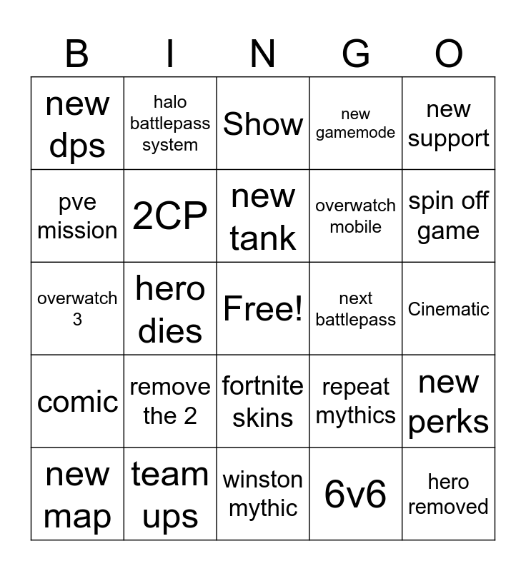 This bingo card has a free space and 24 words: remove the 2, team ups, new tank, new map, new support, new dps, pve mission, halo battlepass system, next battlepass, fortnite skins, overwatch mobile, overwatch 3, repeat mythics, new perks, 2CP, 6v6, Cinematic, Show, spin off game, hero dies, hero removed, comic, new gamemode and winston mythic.