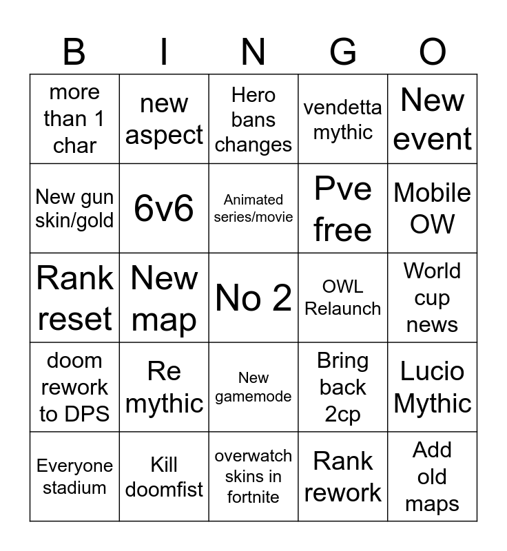 This bingo card has a free space and 24 words: Re mythic, Kill doomfist, Animated series/movie, Everyone stadium, New event, more than 1 char, New gun skin/gold, new aspect, OWL Relaunch, New gamemode, Pve free, Rank reset, Bring back 2cp, Lucio Mythic, 6v6, Rank rework, World cup news, Hero bans changes, Mobile OW, New map, Add old maps, doom rework to DPS, vendetta mythic and overwatch skins in fortnite.