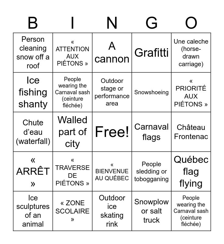 This bingo card has a free space and 55 words: Bonhomme Carnaval, Ice sculptures of an animal, Snowbanks lining the streets, Person cleaning snow off a roof, Outdoor ice skating rink, Queue de Castor (beaver tails), People wearing the Carnaval sash (ceinture fléchée), Maple taffy being made on snow (tire sur la neige), Snowshoeing, People running in the snow, Grafitti, Tourists dancing, Snowplows clearing streets or sidewalks, Québec flag flying in winter, St. Lawrence River with ice or steam rising, Bonhomme Carnaval (statue, banner, or mascot), Une caleche (horse-drawn carriage), Walled part of city, Snowbanks piled along the road, People wearing the Carnaval sash (ceinture fléchée), Carnaval flags, Outdoor skating rink, People sledding or tobogganing, A cannon, Maple taffy stand (tire sur la neige), Outdoor stage or performance area, Snowplow or salt truck, Historic stone buildings covered in snow, Château Frontenac, Québec flag flying, St. Lawrence River with ice flows, RTC city bus with Carnaval advertising, Person dressed up as a fur trader, Calèche- horse-drawn carriage, Ice fishing shanty, Chute d’eau (waterfall), Street performers, « ARRÊT », « DÉFENSE DE STATIONNER »No parking, « SORTIE » / « ENTRÉE » (Exit / Entrance), « ATTENTION AUX PIÉTONS », « GLISSANT EN HIVER » (Slippery in winter ❄️), « DÉNEIGEMENT » (Snow removal), « STATIONNEMENT INTERDIT – DÉNEIGEMENT », « TRAVERSE DE PIÉTONS », « ZONE SCOLAIRE », « RALENTISSEZ » (Slow down!), « PAS DE TOURNANT À DROITE AU FEU ROUGE », « VOIE RÉSERVÉE » (Reserved lane), « PRIORITÉ AUX PIÉTONS », « MERCI DE NE PAS FUMER », « TERRASSE OUVERTE, « CAFÉ / CHOCOLAT CHAUD », « BIENVENUE AU QUÉBEC and « BON CARNAVAL ! ».
