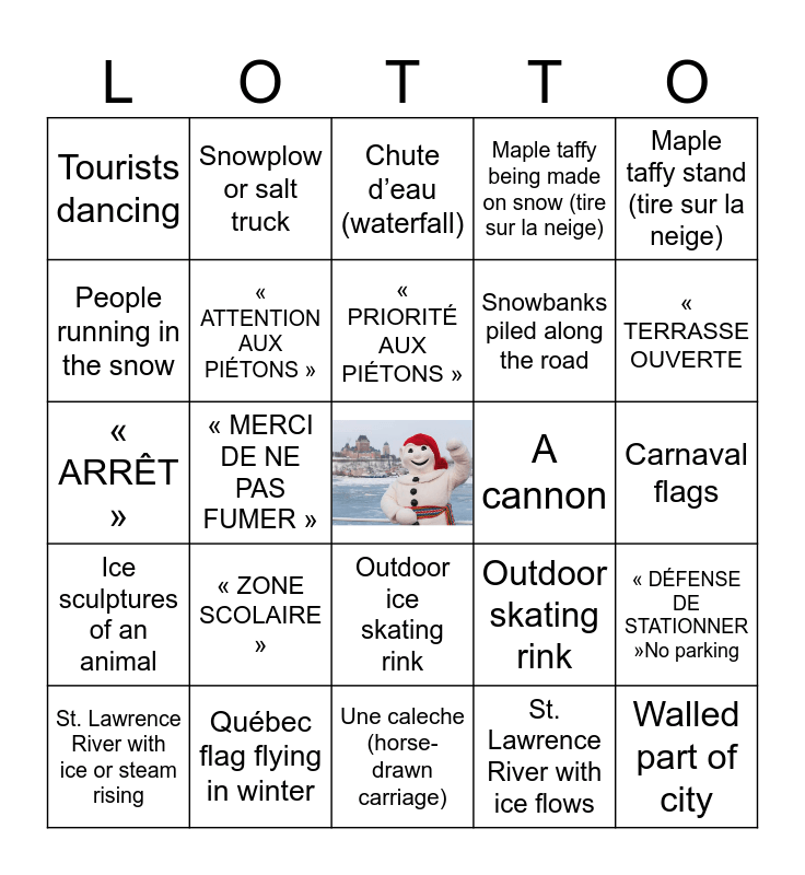 This bingo card has a free space and 54 words: Bonhomme Carnaval a figure or the real one, Ice sculptures of an animal, Snowbanks lining the streets, Person cleaning snow off a roof, Outdoor ice skating rink, Queue de Castor (beaver tails), Maple taffy being made on snow (tire sur la neige), Snowshoeing, People running in the snow, Grafitti, Tourists dancing, Snowplows clearing streets or sidewalks, Québec flag flying in winter, St. Lawrence River with ice or steam rising, Bonhomme Carnaval (statue, banner, or mascot), Une caleche (horse-drawn carriage), Walled part of city, Snowbanks piled along the road, People wearing the Carnaval sash (ceinture fléchée), Carnaval flags, Outdoor skating rink, People sledding or tobogganing, A cannon, Maple taffy stand (tire sur la neige), Outdoor stage or performance area, Snowplow or salt truck, Historic stone buildings covered in snow, Château Frontenac, Québec flag flying, St. Lawrence River with ice flows, RTC city bus with Carnaval advertising, Person dressed up as a fur trader, Calèche- horse-drawn carriage, Ice fishing shanty, Chute d’eau (waterfall), Street performers, « ARRÊT », « DÉFENSE DE STATIONNER »No parking, « SORTIE » / « ENTRÉE » (Exit / Entrance), « ATTENTION AUX PIÉTONS », « GLISSANT EN HIVER » (Slippery in winter ❄️), « DÉNEIGEMENT » (Snow removal), « STATIONNEMENT INTERDIT – DÉNEIGEMENT », « TRAVERSE DE PIÉTONS », « ZONE SCOLAIRE », « RALENTISSEZ » (Slow down!), « PAS DE TOURNANT À DROITE AU FEU ROUGE », « VOIE RÉSERVÉE » (Reserved lane), « PRIORITÉ AUX PIÉTONS », « MERCI DE NE PAS FUMER », « TERRASSE OUVERTE, « CAFÉ / CHOCOLAT CHAUD », « BIENVENUE AU QUÉBEC and « BON CARNAVAL ! ».