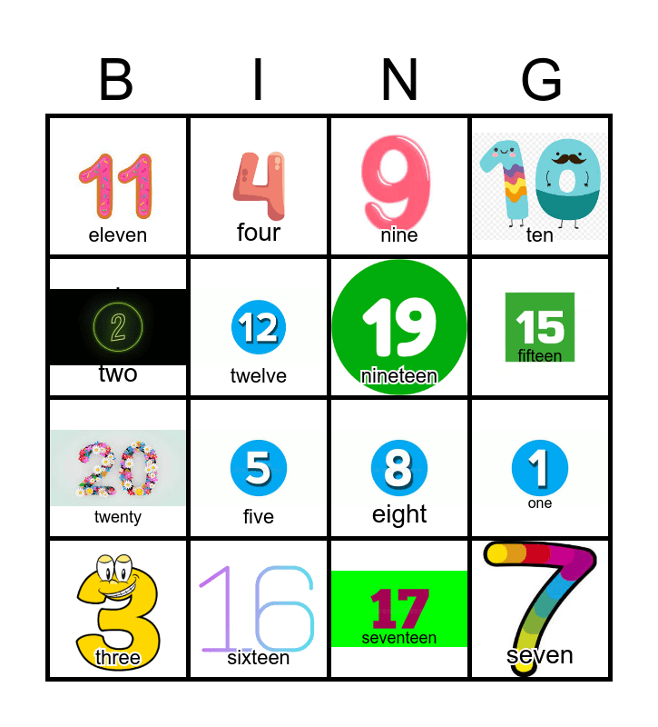This bingo card has 20 images and 20 words: one, fourteen, nine, eighteen, three, . two, sixteen, eleven, twenty, four, five, eight, twelve, seven, nineteen, six, fifteen, ten, seventeen and thirteen.