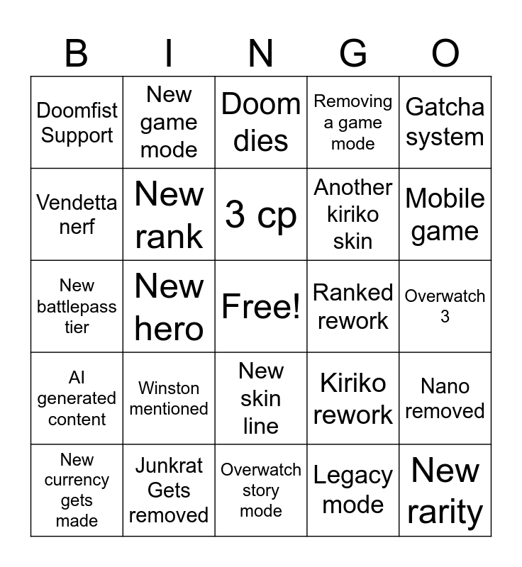This bingo card has a free space and 24 words: Winston mentioned, Junkrat Gets removed, 3 cp, New currency gets made, Gatcha system, Doomfist Support, Vendetta nerf, New game mode, Ranked rework, New skin line, Another kiriko skin, New battlepass tier, Kiriko rework, Nano removed, New rank, Legacy mode, Overwatch 3, Doom dies, Mobile game, New hero, New rarity, AI generated content, Removing a game mode and Overwatch story mode.