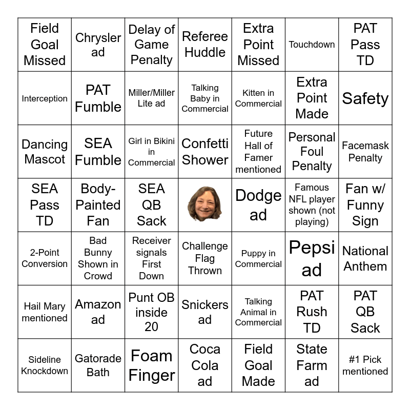 This bingo card has a free space and 59 words: SEA Rush TD, SEA Pass TD, SEA Field Goal, SEA Fumble, SEA QB Sack, PAT Rush TD, PAT Pass TD, PAT Field Goal, PAT Fumble, PAT QB Sack, Referee Huddle, Punt OB inside 20, Touchdown, Receiver signals First Down, Field Goal Made, Field Goal Missed, Extra Point Made, Extra Point Missed, Fumble, Interception, Safety, Delay of Game Penalty, Facemask Penalty, Personal Foul Penalty, 4th Down Conversion, Challenge Flag Thrown, 2-Point Conversion, Budweiser/Bud Light ad, Miller/Miller Lite ad, Pepsi ad, Doritos ad, Amazon ad, Coca Cola ad, State Farm ad, Chrysler ad, Dodge ad, Snickers ad, Kitten in Commercial, Puppy in Commercial, Talking Baby in Commercial, Talking Animal in Commercial, Girl in Bikini in Commercial, Dancing Mascot, Celeb in Crowd, Fan w/ Funny Sign, Sideline Knockdown, Gatorade Bath, Foam Finger, Confetti Shower, Body-Painted Fan, Face-Painted Fan, Hail Mary mentioned, Famous NFL player shown (not playing), Bad Bunny Shown in Crowd, National Anthem, Future Hall of Famer mentioned, Neck Surgery mentioned, #1 Pick mentioned and Drawing on Screen.