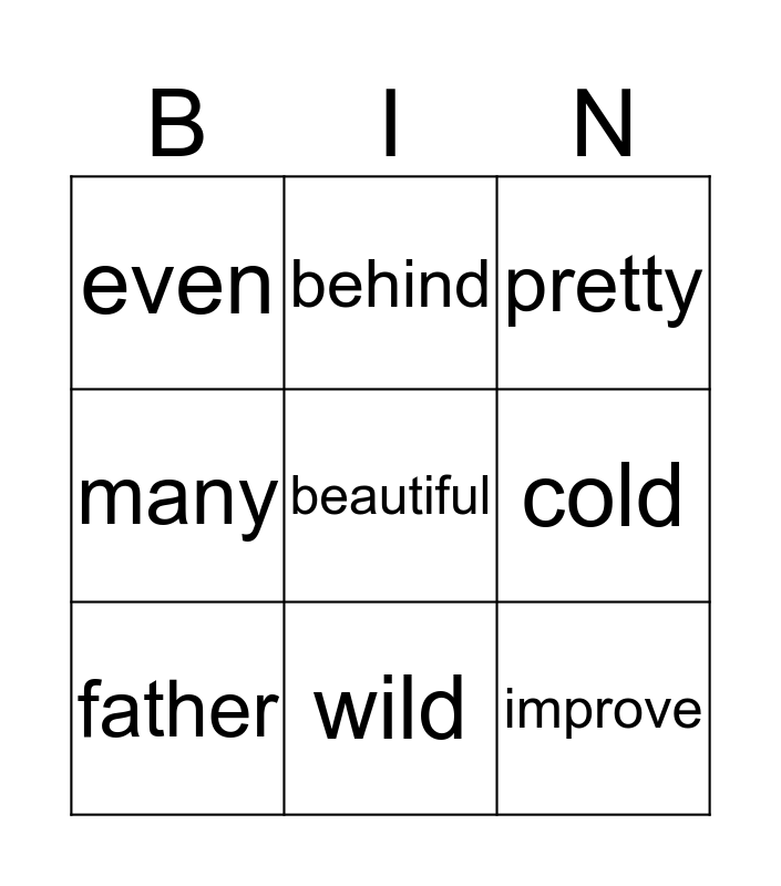 This bingo card has a free space and 8 words: cold, pretty, behind, father, even, improve, many and wild.