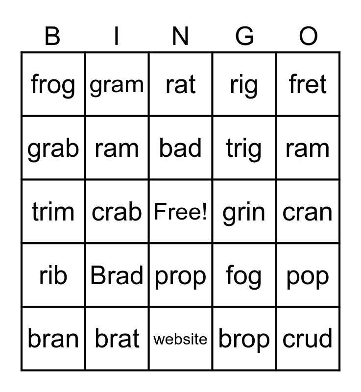 This bingo card has a free space and 24 words: Brad, brat, bad, bran, fret, frog, grab, gram, grin, prop, trig, trim, fog, pop, ram, brop, cran, rat, ram, crab, crud, rib, rig and website.