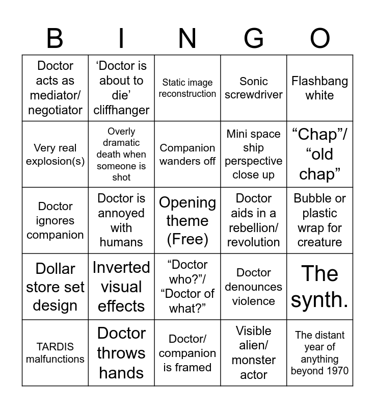 This bingo card has a free space and 24 words: Inverted visual effects, Doctor throws hands, Companion wanders off, TARDIS malfunctions, Flashbang white, Doctor acts as mediator/ negotiator, Very real explosion(s), ‘Doctor is about to die’ cliffhanger, Doctor aids in a rebellion/ revolution, “Doctor who?”/ “Doctor of what?”, Mini space ship perspective close up, Doctor ignores companion, Doctor denounces violence, The synth., Overly dramatic death when someone is shot, Visible alien/ monster actor, Bubble or plastic wrap for creature, Static image reconstruction, “Chap”/ “old chap”, Doctor is annoyed with humans, The distant year of anything beyond 1970, Dollar store set design, Sonic screwdriver and Doctor/ companion is framed.