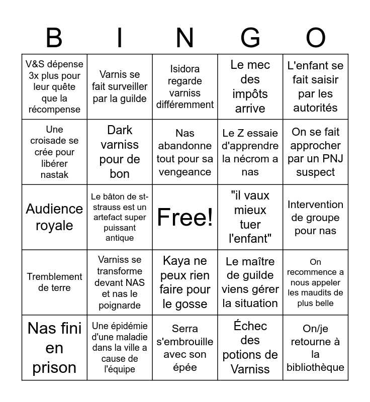 This bingo card has a free space and 24 words: Varniss se transforme devant NAS et nas le poignarde, Une épidémie d'une maladie dans la ville a cause de l'équipe, Nas abandonne tout pour sa vengeance, Nas fini en prison, L'enfant se fait saisir par les autorités, V&S dépense 3x plus pour leur quête que la récompense, Une croisade se crée pour libérer nastak, Varnis se fait surveiller par la guilde, "il vaux mieux tuer l'enfant", Kaya ne peux rien faire pour le gosse, Le Z essaie d'apprendre la nécrom a nas, Audience royale, Le maître de guilde viens gérer la situation, On recommence a nous appeler les maudits de plus belle, Dark varniss pour de bon, Échec des potions de Varniss, Intervention de groupe pour nas, Isidora regarde varniss différemment, On se fait approcher par un PNJ suspect, Le bâton de st-strauss est un artefact super puissant antique, On/je retourne à la bibliothèque, Tremblement de terre, Le mec des impôts arrive and Serra s'embrouille avec son épée.