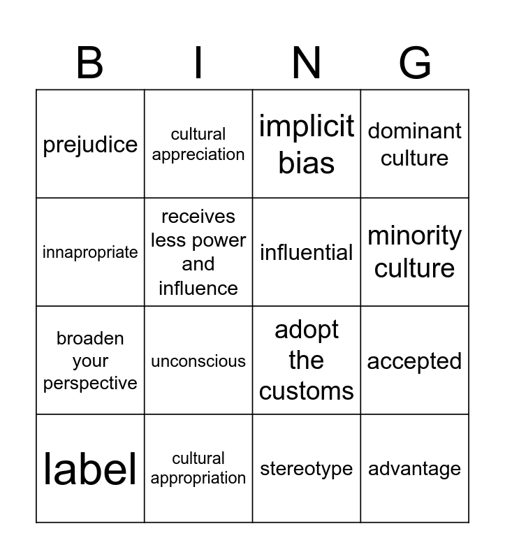 This bingo card has 17 words: stereotype, label, implicit bias, prejudice, unconscious, dominant culture, accepted, influential, minority culture, receives less power and influence, cultural appropriation, adopt the customs, innapropriate, cultural appreciation, broaden your perspective, privilege and advantage.