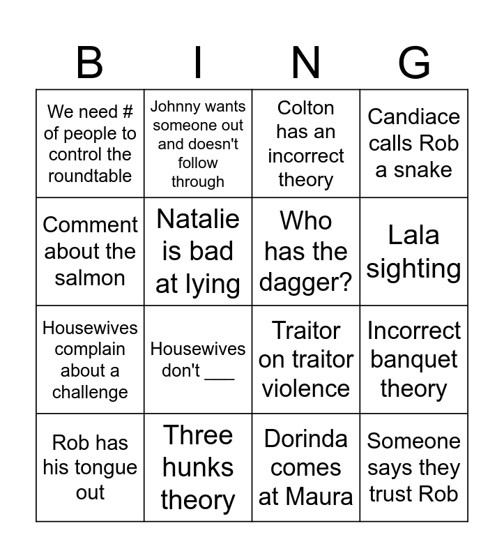 This bingo card has 18 words: Housewives don't ___, Someone says they trust Rob, Colton has an incorrect theory, We need # of people to control the roundtable, Traitor on traitor violence, Candiace calls Rob a snake, Rob has his tongue out, Johnny wants someone out and doesn't follow through, Lala sighting, Housewives complain about a challenge, Dorinda comes at Maura, Comment about the salmon, Incorrect banquet theory, Natalie is bad at lying, Who has the dagger?, Colton changes the group's mind, Three hunks theory and Robby Bobby.