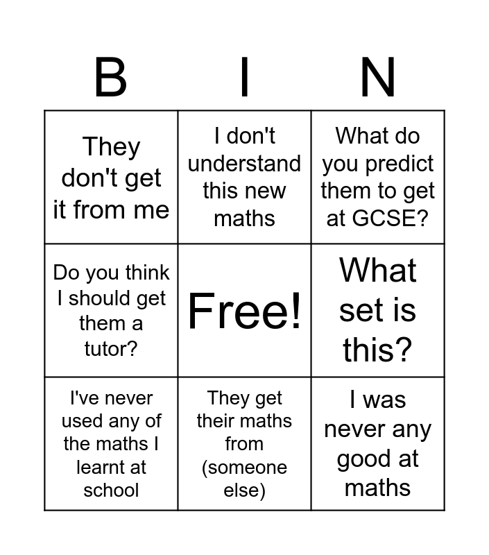 This bingo card has a free space and 8 words: What set is this?, What do you predict them to get at GCSE?, I don't understand this new maths, I've never used any of the maths I learnt at school, They don't get it from me, I was never any good at maths, Do you think I should get them a tutor? and They get their maths from (someone else).