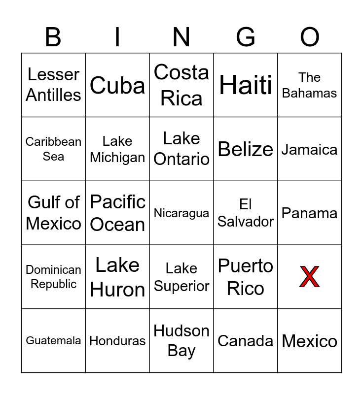 This bingo card has 28 words: X, Atlantic Ocean, Belize, Canada, Caribbean Sea, Costa Rica, Cuba, Dominican Republic, El Salvador, Guatemala, Gulf of Mexico, Haiti, Honduras, Hudson Bay, Jamaica, Lake Erie, Lake Huron, Lake Michigan, Lake Ontario, Lake Superior, Lesser Antilles, Mexico, Nicaragua, Pacific Ocean, Panama, Puerto Rico, The Bahamas and United States.