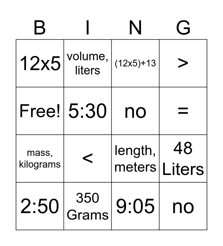 This bingo card has 16 words: 350 Grams, 48 Liters, (12x5)+13, 12x5, mass, kilograms, volume, liters, length, meters, 9:05, Free!, 5:30, 2:50, >, <, =, no and no.