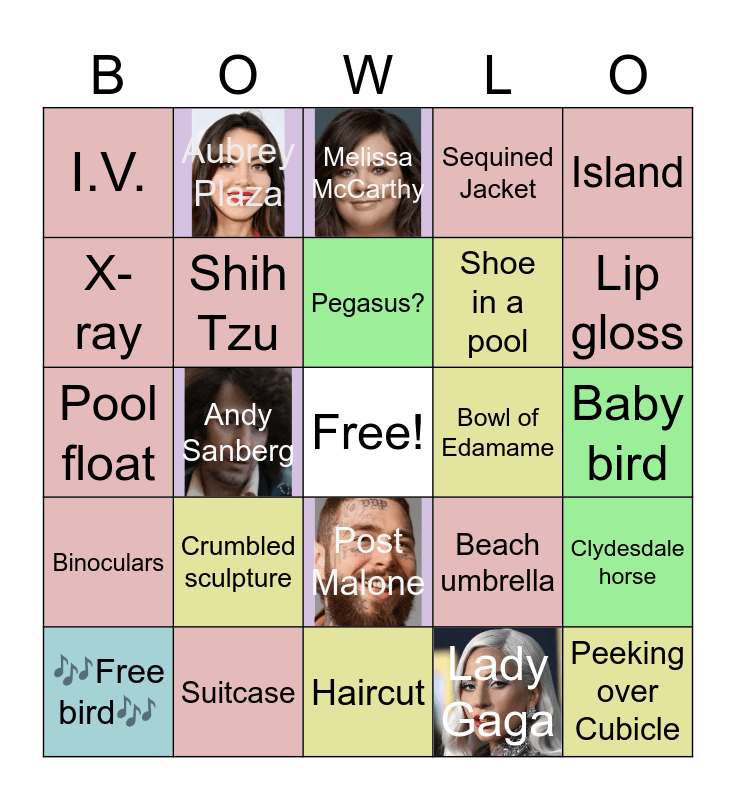 This bingo card has 26 images, a free space and 89 words: Peyton Manning, Sabrina Carpenter, Post Malone, Guy Fieri, Rolling keg, Shane Gillis, Cactus, Cowboy hat, Yacht, Bride, 🎶I Will Always Love You 🎶, 🎶Sweet Caroline 🎶, Clydesdale horse, Baby bird, Eagle, Pegasus?, Kenan Thompson, Octavia Spencer, Ludicrous, Marcello Hernandez, VHS tape, Fancy Tea cup, Haircut, Oil painting, Pool float, Suitcase, Jet plane, Map, Kendall Jenner, Deli hat, Sequined Jacket, Andy Sanberg, Space Shuttle, I.V., Tanning bed, Melissa McCarthy, X-ray, Sombrero, Lip gloss, 🎶Free bird🎶, Binoculars, Neck pillow, 🎶jump in tha line🎶, Birthday cake, Beach umbrella, Bowl of Edamame, Eye patch, Facelift, Blood, Aubrey Plaza, Kurt Russell, Ski lift, 🎶eye of the tiger🎶, Frisbee, Dancing Banana, 🎶Only Time (Enya song)🎶, Gronk, Break dancing, Spike Lee, “Tight ends”, Runaway Trolley car, Derrick Henry, Taika Waititi, Embarrassed Bear, Skate board, Red carpet, Onyx toilet, William Schatner, Serena Williams, Crumbled sculpture, Peeking over Cubicle, “Employee of the Month”, “Sand skiing”, Shoe in a pool, Shih Tzu, Lady Gaga, Piano, Sofía Vergara, Bowen Yang, 🎶Won’t you be my neighbor🎶, Island, Disco ball, Android Robot (Not phone), Emma Stone, Keegan-Michael Key, Car keys, Roller coaster, “You must be this tall…” and Animal noises.