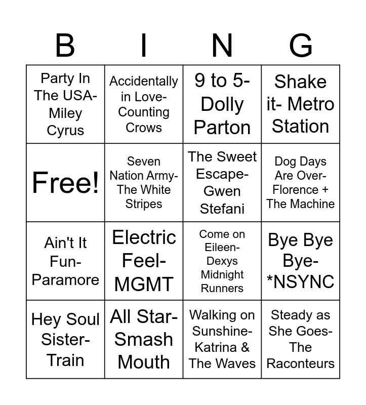 This bingo card has 16 words: All Star- Smash Mouth, Bye Bye Bye- *NSYNC, 9 to 5- Dolly Parton, Party In The USA- Miley Cyrus, Ain't It Fun- Paramore, Accidentally in Love- Counting Crows, Come on Eileen- Dexys Midnight Runners, Walking on Sunshine- Katrina & The Waves, Free!, Seven Nation Army- The White Stripes, Hey Soul Sister- Train, Shake it- Metro Station, Electric Feel- MGMT, Dog Days Are Over- Florence + The Machine, The Sweet Escape- Gwen Stefani and Steady as She Goes- The Raconteurs.