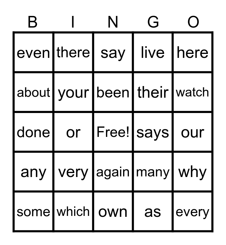 This bingo card has a free space and 32 words: as, all, or, give, any, your, here, why, there, her, been, say, one, where, says, goes, some, done, again, very, many, look, our, which, every, live, their, about, even, own, gone and watch.