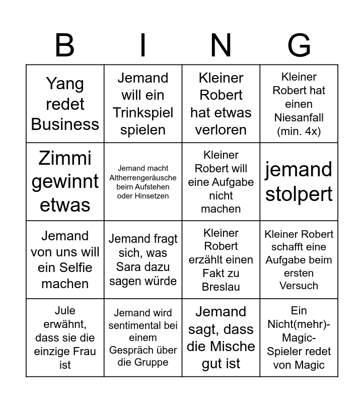 This bingo card has 23 words: Ein Nicht(mehr)-Magic-Spieler redet von Magic, Eine Person sagt, wie besoffen sie ist, jemand stolpert, Jemand macht einen schlechten Boomerwitz über die Ehe, Zimmi gewinnt etwas, Yang redet Business, Jemand macht Altherrengeräusche beim Aufstehen oder Hinsetzen, Jemand will ein Trinkspiel spielen, Jule erwähnt, dass sie die einzige Frau ist, Sven macht einen Wortwitz, Jemand fragt sich, was Sara dazu sagen würde, Jemand von uns will ein Selfie machen, Ein Getränk wird verschüttet, Jemand will Magic- oder Pokémonkarten kaufen, Jemand wird sentimental bei einem Gespräch über die Gruppe, Dima psychologisiert jemanden, Kleiner Robert hat etwas verloren, Kleiner Robert erzählt einen Fakt zu Breslau, Kleiner Robert will eine Aufgabe nicht machen, Kleiner Robert schafft eine Aufgabe beim ersten Versuch, Kleiner Robert hat einen Niesanfall (min. 4x), Jemand sagt, dass die Mische gut ist and Jemand erwähnt die Breslau-Zwerge.