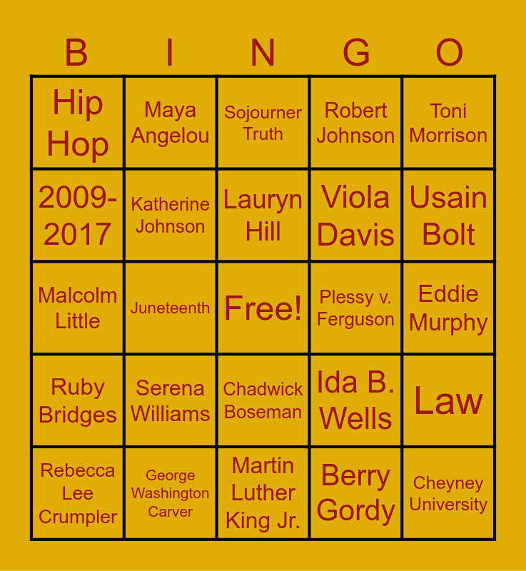 This bingo card has a free space and 103 words: Barack Obama, 1976, Toni Morrison, Brown v. Board of Education, Thurgood Marshall, Jackie Robinson, Civil Rights Movement, Nelson Mandela, Booker T. Washington, The Montgomery Bus Boycott, Mae Jemison, Frederick Douglass, The 13th Amendment, Louis Armstrong, 1950s - 60s, Harriet Tubman, Sojourner Truth, Carter G Woodson, Kamala Harris, Black Lives Matter, Jesse Owens, W.E.B. Du Bois, Ida B. Wells, Mary Ovington, Madam C.J. Walker, Aretha Franklin, Michael Jackson, Serena Williams, Usain Bolt, Robert Johnson, Anika Noni Rose, Althea Gibson, Ida B. Wells, Berry Gordy, Vanessa Williams, 2021, Huey P. Newton & Bobby Seale, Jazz, Ryan Coogler, Hattie McDaniel, Lauryn Hill, George Washington Carver, Denzel Washington, Ruby Bridges, 2022, 2009-2017, Black Wall Street, Hip Hop, NAACP, Cheyney University, Oprah Winfrey, Spelman College, Bessie Coleman, Hair grower, The Greatest, Gymnastics, Brooklyn Dodgers, Samuel L. Jackson, Track and Field, North Carolina A&T, Morehouse College, Chadwick Boseman, Eddie Murphy, I will always love you, Ella Fitzgerald, 1879, TLC, Usher, Brandy, Maya Angelou, Malcolm Little, Juneteenth, Martin Luther King Jr., The Harlem Renaissance, James Brown, Chuck Cooper, John Bradley, Shirley Chisolm, Carter G. Woodson, Rebecca Lee Crumpler, Colin Powell, Alice Coachman, Morehouse College, Hiram Revels, Katherine Johnson, Fritz Pollard, Plessy v. Ferguson, 1964, Gwendolyn Brooks, Garrett Morgan, Carol Moseley Braun, Tony Dungy, The Chicago Defender, Tuskegee Airmen, Law, Beyonce, Ben Carson, Amanda Gorman, Viola Davis, Black Panther, Michael Jordan, Ketanji Brown Jackson, Bryson Tiller, Jazmine Sullivan and H.E.R..
