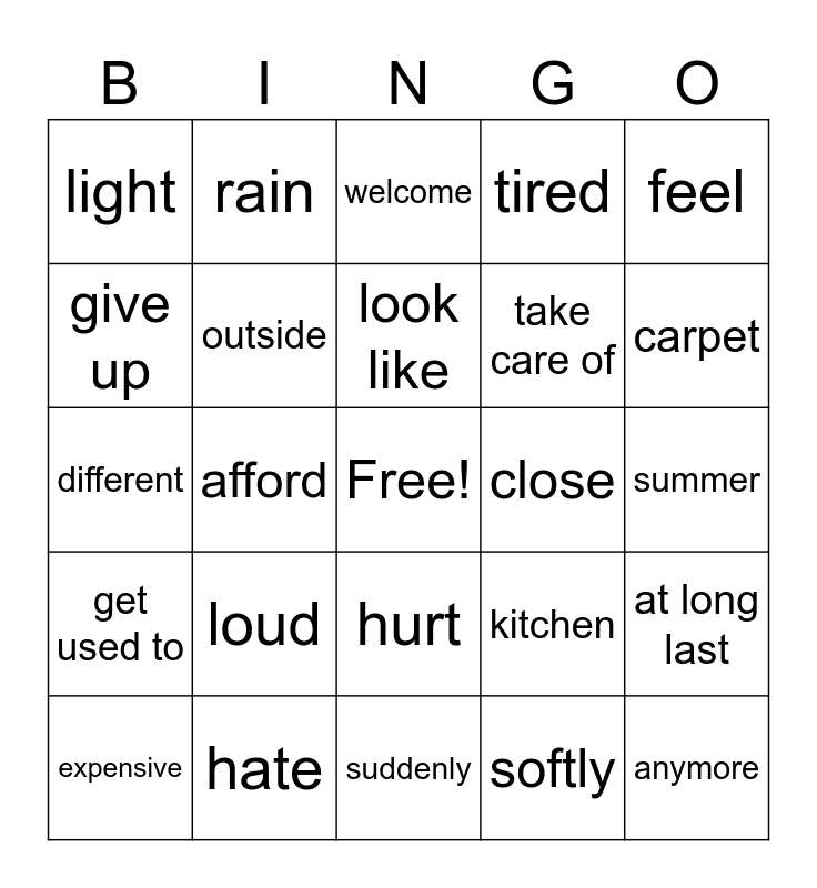 This bingo card has a free space and 29 words: expensive, wake up, afford, spend (time), light, welcome, outside, loud, close, hate, summer, anymore, suddenly, softly, carpet, private, hurt, get used to, feel, different, kitchen, lock, take care of, give up, tired, rain, at long last, look like and gray.