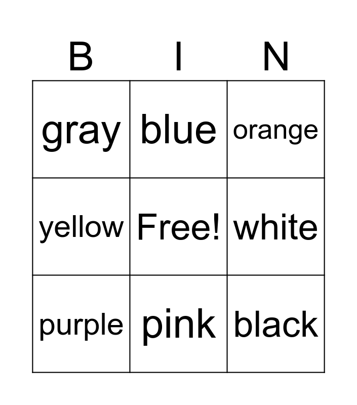 This bingo card has a free space and 11 words: Red, pink, black, purple, blue, orange, white, green, yellow, gray and brown.