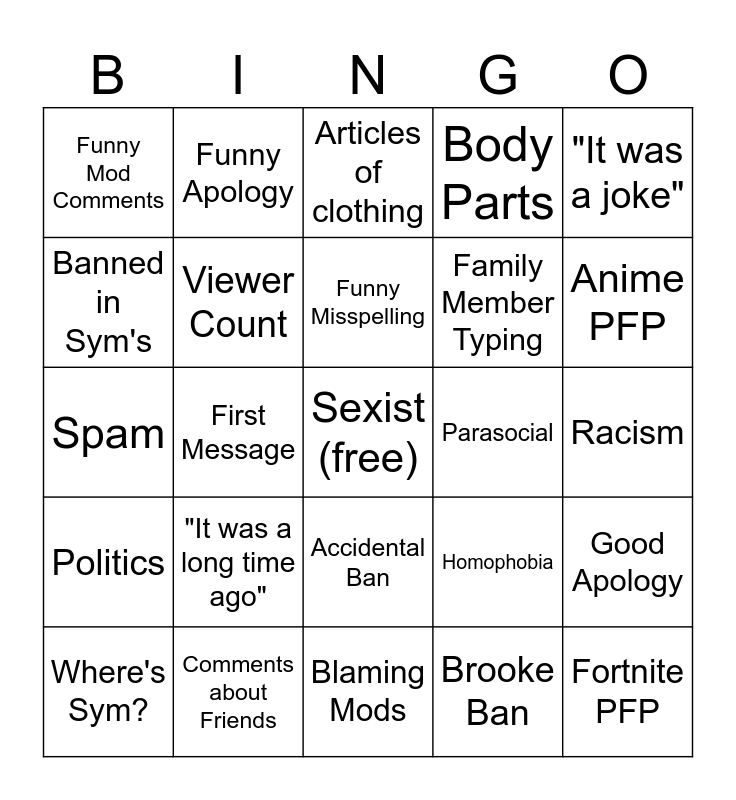 This bingo card has a free space and 28 words: Good Apology, Doubling Down, Family Member Typing, Brooke Ban, Banned in Sym's, Articles of clothing, Funny Apology, Politics, Parasocial, Where's Sym?, Spam, Body Parts, Comments about Friends, Blaming Mods, Anime PFP, No clue why banned, "It was a long time ago", Viewer Count, Funny Misspelling, Accidental Ban, Funny Mod Comments, Repeat Offender, Fortnite PFP, First Message, Racism, Homophobia, "It was a joke" and "You're soft".