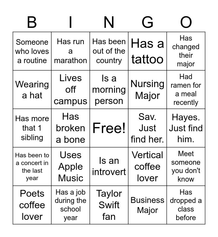 This bingo card has a free space and 40 words: Is from out of state, Has more that 1 sibling, Lives on campus, Lives off campus, Has a job during the school year, Is an introvert, Is a morning person, Is a night owl, Has changed their major, Has been to a concert in the last year, Has broken a bone, Has a tattoo, Has dropped a class before, Hayes. Just find him., Sav. Just find her., Uses Apple Music, Has skipped class this semester, Someone who loves a routine, Someone who has a nickname. What is it??, Has been out of the country, Meet someone you don't know, Business Major, Nursing Major, Wearing a hat, Is an extrovert, Uses Spotify, Has green eyes, Has brown hair, FREE, Someone who loves Drake Maye, Someone who LOVES a google calendar, Poets coffee lover, Soul Craft lover, Vertical coffee lover, Had ramen for a meal recently, Taylor Swift fan, Taylor Swift hater, Has met a celebrity, Has run a marathon and Knows a second language.