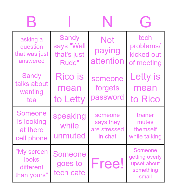 This bingo card has 17 words: Free!, "My screen looks different than yours", Not paying attention, asking a question that was just answered, speaking while unmuted, tech problems/ kicked out of meeting, trainer mutes themself while talking, someone forgets password, Letty is mean to Rico, Rico is mean to Letty, Someone goes to tech cafe, someone says they are stressed in chat, Sandy talks about wanting tea, Sandy says "Well that's just Rude", Someone is looking at there cell phone, Eating a full meal on camera and Someone getting overly upset about something small.