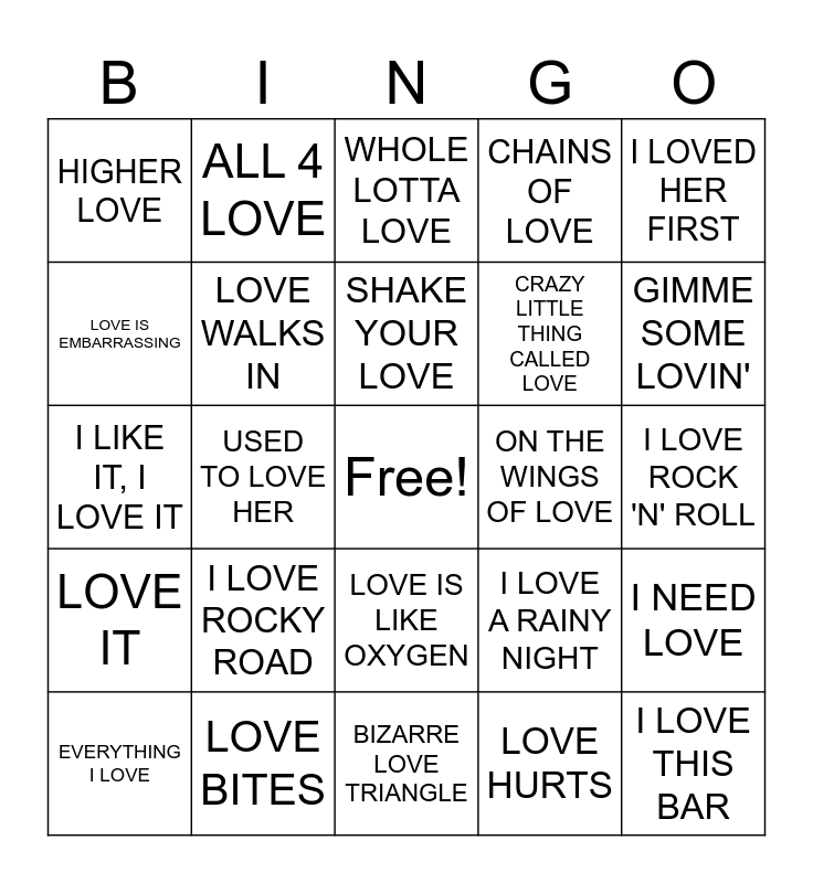 This bingo card has a free space and 71 words: 50 WAYS TO LEAVE YOUR LOVER, ALL 4 LOVE, ALL I WANNA DO IS MAKE LOVE TO YOU, AND I LOVE HER, BIZARRE LOVE TRIANGLE, CAN'T GET ENOUGH OF YOUR LOVE, CHAINS OF LOVE, CRAZY IN LOVE, CRAZY LITTLE THING CALLED LOVE, EVERLASTING LOVE, EVERYTHING I LOVE, GIMME ALL YOUR LOVIN', GIMME SOME LOVIN', HIGHER LOVE, I HONESTLY LOVE YOU, I LIKE IT, I LOVE IT, I LOVE A RAINY NIGHT, I LOVED HER FIRST, I LOVE IT, I LOVE ROCK 'N' ROLL, I LOVE ROCKY ROAD, I LOVE THIS BAR, I NEED LOVE, IS THIS LOVE, I WILL ALWAYS LOVE YOU, I WOKE UP IN LOVE THIS MORNING, JUNGLE LOVE, LAY ALL YOUR LOVE ON ME, LIVIN' ON LOVE, THE LOOK OF LOVE, LOVE BITES, LOVE BUZZ, LOVE CAN BUILD A BRIDGE, LOVEFOOL, LOVE HURTS, LOVE IS A BATTLEFIELD, LOVE IS AN OPEN DOOR, LOVE IS A WONDERFUL TH8ING, LOVE IS EMBARRASSING, LOVE IS LIKE A ROCK, LOVE IS LIKE OXYGEN, LOVE IS STRANGE, LOVE IT, LOVE ON THE ROCKS, LOVE SHACK, LOVE SONG, LOVE STINKS, LOVE WALKS IN, LOVE WILL KEEP US TOGETHER, LOVIN' EVERY MINUTE OF IT, LOVIN', TOUCHIN', SQUEEZIN', MY LOVE, ON THE WINGS OF LOVE, THE POWER OF LOVE, RUDY DON'T TAKE YOUR LOVE TO TOWN, SEA OF LOVE, SHAKE YOUR LOVE, SHE LOVES YOU, STONED LOVE, SUMMER LOVE, THINK I'M IN LOVE, THIS LOVE, USED TO LOVE HER, WASTING LOVE, WHEN IT'S LOVE, WHERE IS THE LOVE?, WHOLE LOTTA LOVE, WILL YOU LOVE ME TOMORROW, YOU CAN'T HURRY LOVE, YOU GIVE LOVE A BAD NAME and YOUR LOVE.