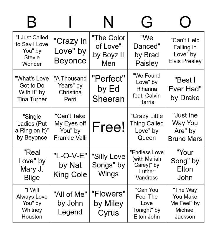 This bingo card has a free space and 24 words: "L-O-V-E" by Nat King Cole, "All of Me" by John Legend, "Perfect" by Ed Sheeran, "I Will Always Love You" by Whitney Houston, "Can't Help Falling in Love" by Elvis Presley, "I Just Called to Say I Love You" by Stevie Wonder, "What's Love Got to Do With It" by Tina Turner, "Crazy in Love" by Beyonce, "Crazy Little Thing Called Love" by Queen, "Silly Love Songs" by Wings, "We Found Love" by Rihanna feat. Calvin Harris, "Single Ladies (Put a Ring on It)" by Beyonce, "Endless Love (with Mariah Carey)" by Luther Vandross, "Your Song" by Elton John, "A Thousand Years" by Christina Perri, "Can You Feel The Love Tonight" by Elton John, "Just the Way You Are" by Bruno Mars, "The Color of Love" by Boyz II Men, "Best I Ever Had" by Drake, "Can't Take My Eyes off You" by Frankie Valli, "The Way You Make Me Feel" by Michael Jackson, "Real Love" by Mary J. Blige, "We Danced" by Brad Paisley and "Flowers" by Miley Cyrus.
