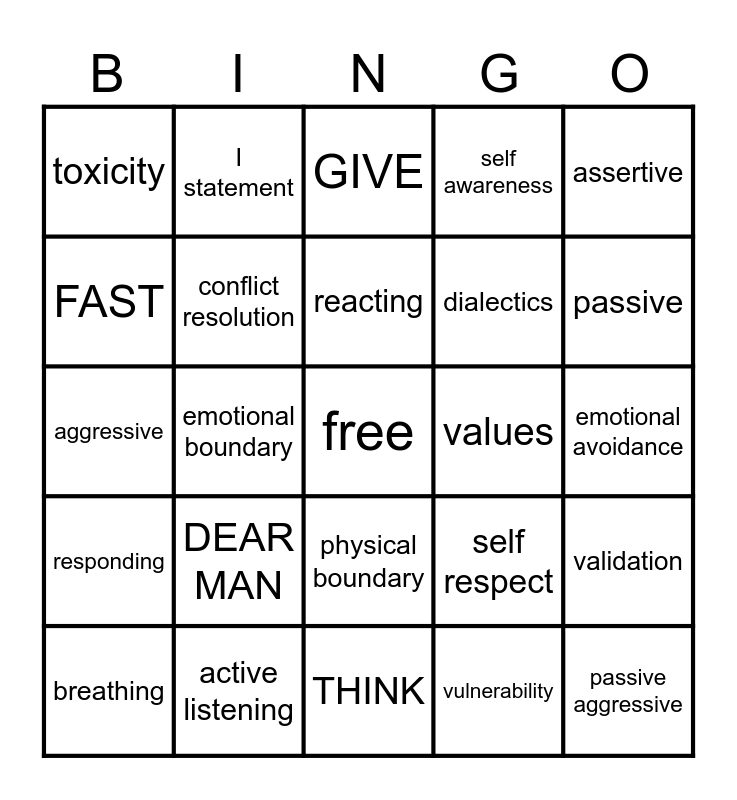 This bingo card has a free space and 24 words: DEAR MAN, active listening, reacting, breathing, assertive, toxicity, FAST, I statement, values, physical boundary, dialectics, aggressive, self respect, validation, conflict resolution, vulnerability, emotional avoidance, GIVE, passive, emotional boundary, passive aggressive, responding, self awareness and THINK.