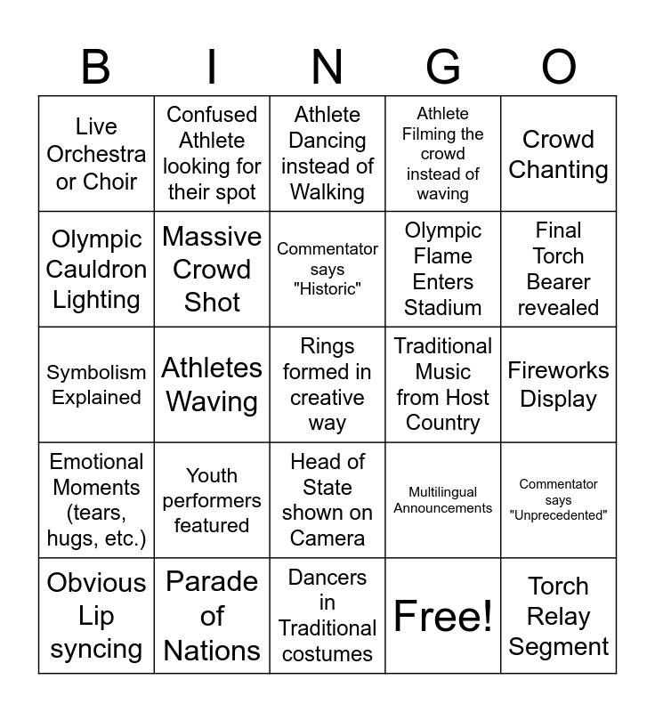 This bingo card has 30 words: Parade of Nations, Team USA Enters, Athletes Waving, Celebrity Appearance, Live Orchestra or Choir, Athlete Dancing instead of Walking, Massive Crowd Shot, Head of State shown on Camera, Traditional Music from Host Country, Dancers in Traditional costumes, Fireworks Display, Rings formed in creative way, Free!, Torch Relay Segment, Final Torch Bearer revealed, Flag Bearer struggling with flag, Multilingual Announcements, Emotional Moments (tears, hugs, etc.), Youth performers featured, Crowd Chanting, Symbolism Explained, Over the top Costume or Headpiece, Confused Athlete looking for their spot, Olympic Flame Enters Stadium, Olympic Cauldron Lighting, Athlete Filming the crowd instead of waving, Commentator says "Unprecedented", Obvious Lip syncing, Commentator says "Historic" and Mention of climate or sustainability.