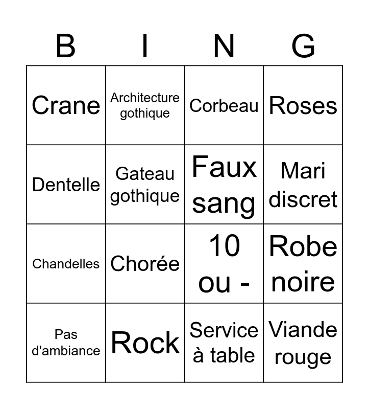 This bingo card has 16 words: Rock, Robe noire, Corbeau, Crane, Chandelles, Architecture gothique, 10 ou -, Service à table, Dentelle, Gateau gothique, Pas d'ambiance, Roses, Chorée, Mari discret, Faux sang and Viande rouge.