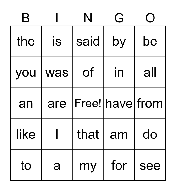 This bingo card has a free space and 24 words: I, a, of, to, be, the, you, is, have, that, in, an, am, do, was, for, from, said, all, are, see, like, by and my.