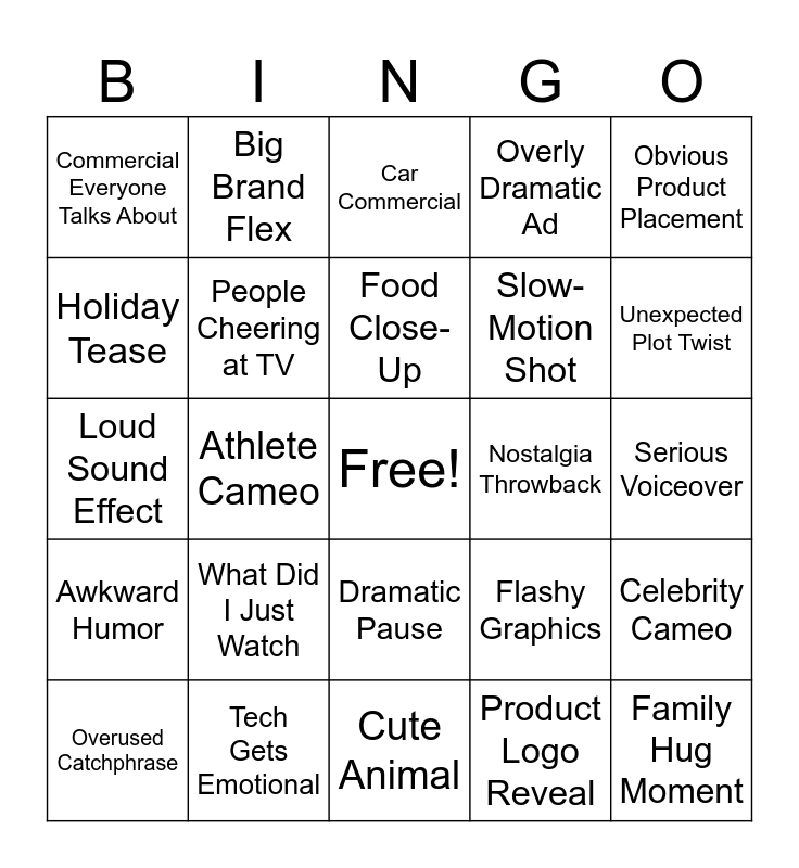 This bingo card has a free space and 24 words: What Did I Just Watch, Tech Gets Emotional, Food Close-Up, Overused Catchphrase, Obvious Product Placement, Commercial Everyone Talks About, Holiday Tease, Big Brand Flex, Nostalgia Throwback, Dramatic Pause, Slow-Motion Shot, Loud Sound Effect, Flashy Graphics, Celebrity Cameo, People Cheering at TV, Product Logo Reveal, Serious Voiceover, Car Commercial, Unexpected Plot Twist, Athlete Cameo, Family Hug Moment, Awkward Humor, Overly Dramatic Ad and Cute Animal.