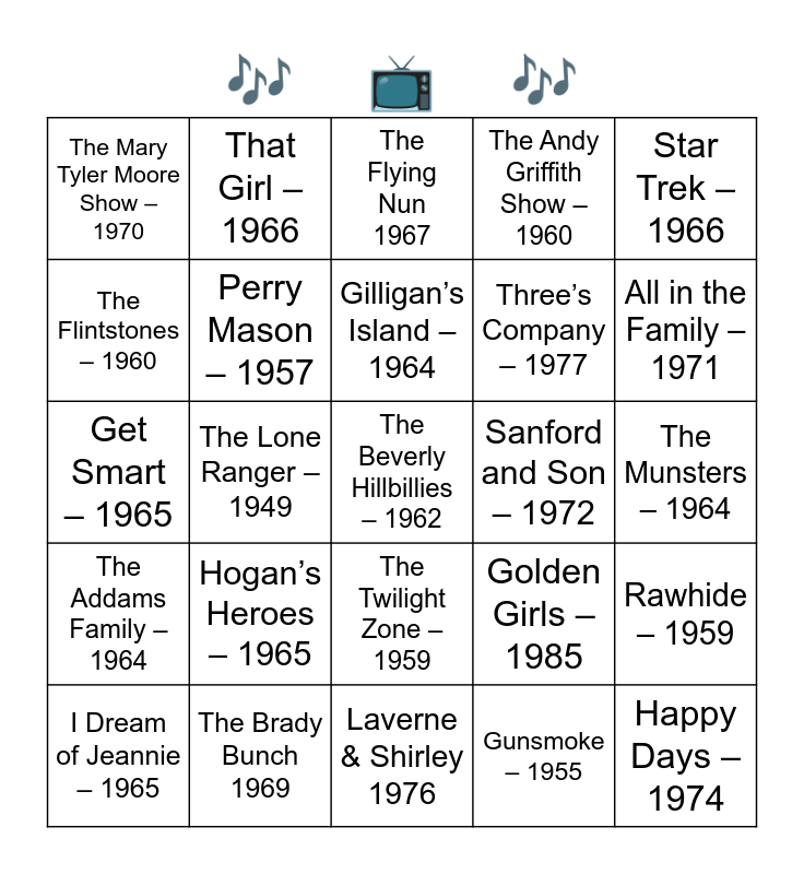 This bingo card has 35 words: I Love Lucy – 1951, Dragnet – 1951, Leave It to Beaver – 1957, Perry Mason – 1957, The Twilight Zone – 1959, The Andy Griffith Show – 1960, The Flintstones – 1960, Mission: Impossible – 1966, Gilligan’s Island – 1964, Bewitched – 1964, Get Smart – 1965, Star Trek – 1966, Batman – 1966, M*A*S*H – 1972, The Mary Tyler Moore Show – 1970, Sanford and Son – 1972, Gunsmoke – 1955, The Lone Ranger – 1949, The Addams Family – 1964, The Beverly Hillbillies – 1962, Golden Girls – 1985, I Dream of Jeannie – 1965, Rawhide – 1959, The Brady Bunch 1969, The Flying Nun 1967, All in the Family – 1971, Happy Days – 1974, The Jeffersons – 1975, Three’s Company – 1977, The Munsters – 1964, Green Acres – 1965, Laverne & Shirley 1976, Hogan’s Heroes – 1965, That Girl – 1966 and The Love Boat – 1977.