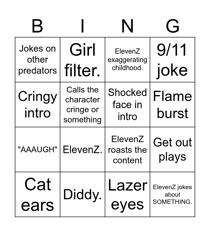This bingo card has 16 words: Diddy., Get out plays, ElevenZ exaggerating childhood., Jokes on other predators, "AAAUGH", Girl filter., ElevenZ roasts the content, Lazer eyes, Cringy intro, Calls the character cringe or something, Cat ears, 9/11 joke, ElevenZ., Flame burst, Shocked face in intro and ElevenZ jokes about SOMETHING..