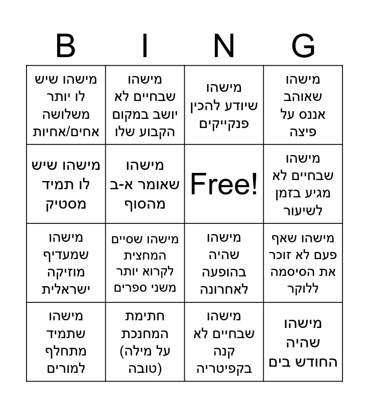 This bingo card has 28 words: Free!, מישהו שאומר "תודה" ב-5 שפות, מישהו שבחיים לא קנה בקפיטריה, מישהו עם 1000+ עוקבים, מישהו שיש לו תמיד מסטיק, מישהו שבחיים לא יושב במקום הקבוע שלו, מישהו שיודע להכין פנקייקים, מישהו שאף פעם לא זוכר את הסיסמה ללוקר, מישהו שמעדיף מוזיקה ישראלית, חתימת המחנכת (על מילה טובה), מישהו שקם לפני 6:30 בבוקר, מישהו שאוהב אננס על פיצה, מישהו שזוכר את המבחן הראשון, מישהו שיעבוד בחופש הגדול, מישהו שהצטרף לכיתה השנה, מישהו שהיה ב-5 מדינות, מישהו שמעדיף ללמוד בבוקר, מישהו שאומר א-ב מהסוף, מישהו שהיה בהופעה לאחרונה, מישהו שהיה החודש בים, מישהו שיש לו יותר משלושה אחים/אחיות, מישהו שיודע לחקות ממש טוב את המחנכת, מישהו שלא משתמש בטלפון שלו בכלל בביהס, מישהו שבחיים לא מגיע בזמן לשיעור, מישהו שתמיד מתחלף למורים, מישהו שסיים המחצית לקרוא יותר משני ספרים, Free! and Free!.