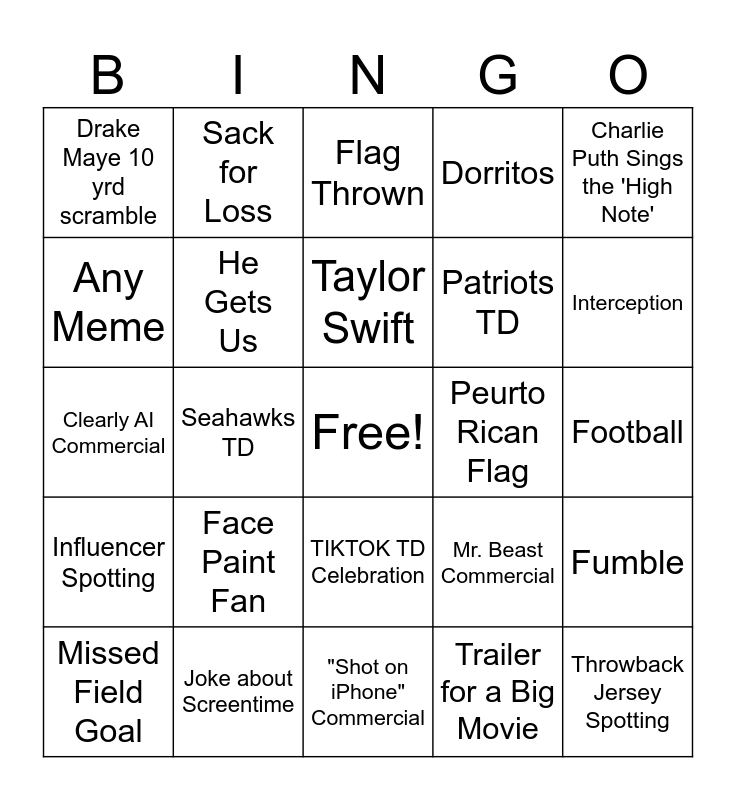 This bingo card has a free space and 25 words: Face Paint Fan, "Shot on iPhone" Commercial, Taylor Swift, Missed Field Goal, Charlie Puth Sings the 'High Note', Drake Maye 10 yrd scramble, Any Meme, Sack for Loss, Peurto Rican Flag, TIKTOK TD Celebration, Patriots TD, Clearly AI Commercial, Mr. Beast Commercial, Fumble, He Gets Us, "6-7", Football, Flag Thrown, Interception, Seahawks TD, Throwback Jersey Spotting, Joke about Screentime, Influencer Spotting, Dorritos and Trailer for a Big Movie.