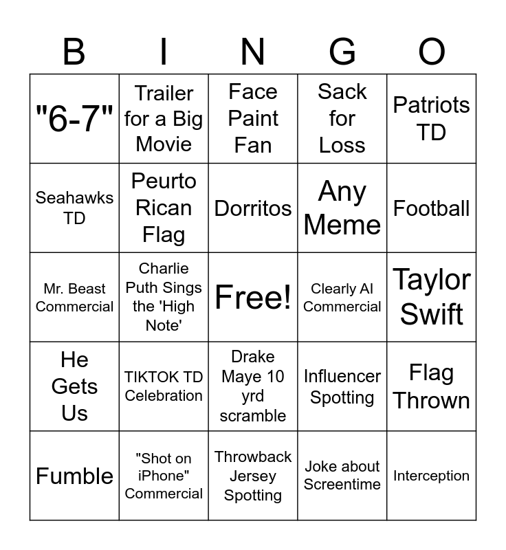 This bingo card has a free space and 25 words: TIKTOK TD Celebration, Throwback Jersey Spotting, Dorritos, Fumble, Patriots TD, "6-7", Seahawks TD, Trailer for a Big Movie, Clearly AI Commercial, Drake Maye 10 yrd scramble, Any Meme, Mr. Beast Commercial, Influencer Spotting, Flag Thrown, Peurto Rican Flag, Missed Field Goal, Taylor Swift, Face Paint Fan, Football, Charlie Puth Sings the 'High Note', Interception, "Shot on iPhone" Commercial, He Gets Us, Sack for Loss and Joke about Screentime.