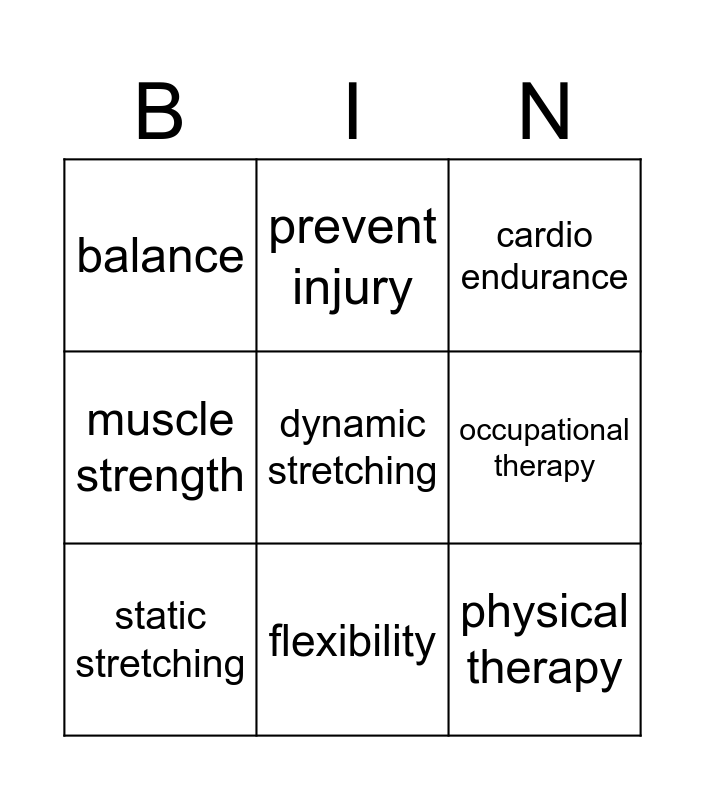 This bingo card has 10 words: flexibility, cardio endurance, balance, dynamic stretching, muscle strength, static stretching, prevent injury, stop immediately, occupational therapy and physical therapy.