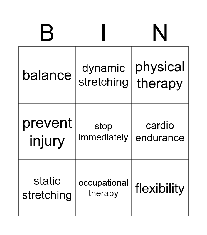 This bingo card has 10 words: occupational therapy, physical therapy, balance, stop immediately, prevent injury, static stretching, dynamic stretching, muscle strength, cardio endurance and flexibility.