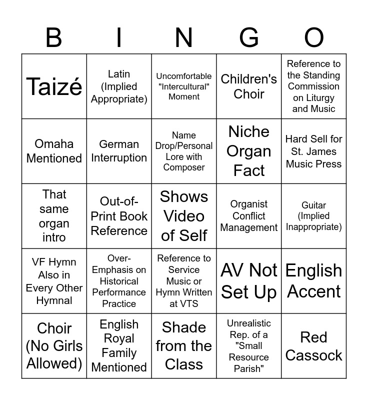 This bingo card has a free space and 24 words: Over-Emphasis on Historical Performance Practice, English Royal Family Mentioned, Name Drop/Personal Lore with Composer, Choir (No Girls Allowed), Reference to the Standing Commission on Liturgy and Music, Taizé, Omaha Mentioned, Latin (Implied Appropriate), Organist Conflict Management, Reference to Service Music or Hymn Written at VTS, Niche Organ Fact, That same organ intro, AV Not Set Up, English Accent, German Interruption, Unrealistic Rep. of a "Small Resource Parish", Guitar (Implied Inappropriate), Uncomfortable "Intercultural" Moment, Hard Sell for St. James Music Press, Out-of-Print Book Reference, Red Cassock, VF Hymn Also in Every Other Hymnal, Children's Choir and Shade from the Class.