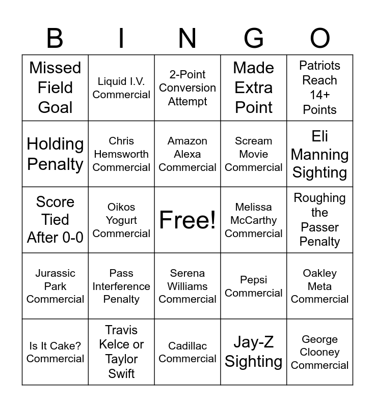 This bingo card has a free space and 78 words: Upheld Replay Challenge, Overturned Replay Challenge, 2-Point Conversion Attempt, Successful 4th Down Play, Failed 4th Down Play, Special Teams/Defense TD, Rushing TD Seahawks, Passing TD Seahawks, Rushing TD Patriots, Passing TD Patriots, Interception, Fumble Recovery by Defense, Made Extra Point, Missed Field Goal, Made Field Goal, Holding Penalty, False Start Penalty, Pass Interference Penalty, Face Mask Penalty, Roughing the Passer Penalty, Seahawks Reach 14+ Points, Patriots Reach 14+ Points, Score Tied After 0-0, Amazon Alexa Commercial, Chris Hemsworth Commercial, Base44 Commercial, Guy Fieri Commercial, Clydesdale Commercial, Bud Light Commercial, Peyton Manning Commercial, Eli Manning Sighting, Dove Commercial, Cadillac Commercial, Dunkin Commercial, Is It Cake? Commercial, Melissa McCarthy Commercial, Fanatics Sportsbook Commercial, FanDuel Commercial, Frank’s Red Hot Commercial, George Clooney Commercial, ‘He Gets Us’ Commercial, Hellmann’s Mayo Commercial, Kellogg’s Raisin Bran Commercial, Instacart Commercial, Kinder Bueno Commercial, Liquid I.V. Commercial, Michelob Ultra Commercial, Nerds Commercial, Novartis Commercial, Novo Nordisk Commercial, Oakley Meta Commercial, Oikos Yogurt Commercial, Pepsi Commercial, Poppi Commercial, Sabrina Carpenter Commercial, Ramp Commercial, Ring Commercial, Rippling Commercial, Jon Hamm Commercial, Serena Williams Commercial, Scream Movie Commercial, Squarespace Commercial, State Farm Commercial, Svedka Commercial, Backstreet Boys Commercial, TurboTax Commercial, Matthew McConaughey, Volkswagen Commercial, Jurassic Park Commercial, Travis Kelce or Taylor Swift, Patriots QB Sacked, Seahawks QB Sacked, 20-Yard Run Play, 30-Yard Pass Play, Jay-Z Sighting, The Rock Sighting, Kevin Hart Sighting and Olympic Skiing Promotion.