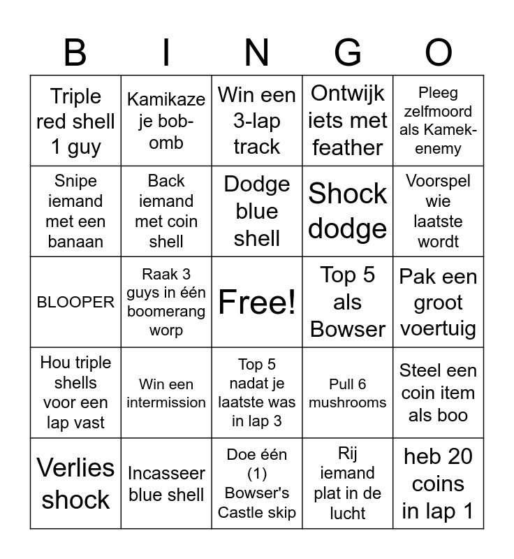 This bingo card has a free space and 24 words: Win een intermission, Incasseer blue shell, Dodge blue shell, Verlies shock, Pleeg zelfmoord als Kamek-enemy, Triple red shell 1 guy, Snipe iemand met een banaan, Kamikaze je bob-omb, Top 5 als Bowser, Top 5 nadat je laatste was in lap 3, Shock dodge, BLOOPER, Pull 6 mushrooms, Steel een coin item als boo, Back iemand met coin shell, Rij iemand plat in de lucht, Pak een groot voertuig, Win een 3-lap track, Voorspel wie laatste wordt, Raak 3 guys in één boomerang worp, heb 20 coins in lap 1, Hou triple shells voor een lap vast, Ontwijk iets met feather and Doe één (1) Bowser's Castle skip.