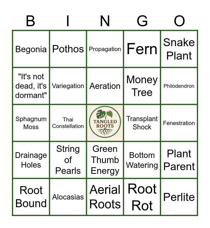 This bingo card has a free space and 34 words: Monstera, Root Rot, Hoya, Chlorophyll, Drainage Holes, Variegation, Snake Plant, Root Bound, Pothos, Succulent, Aeration, Propagation, Calathea, "Just one more.. I promise!", Transplant Shock, Philodendron, Alocasias, Sphagnum Moss, String of Pearls, Bottom Watering, Green Thumb Energy, Overwatering, Begonia, Fenestration, Aerial Roots, Perlite, Fern, Pot Up, Money Tree, "It's not dead, it's dormant", Swiss Cheese plant, Thai Constellation, Plant Parent and Croton.