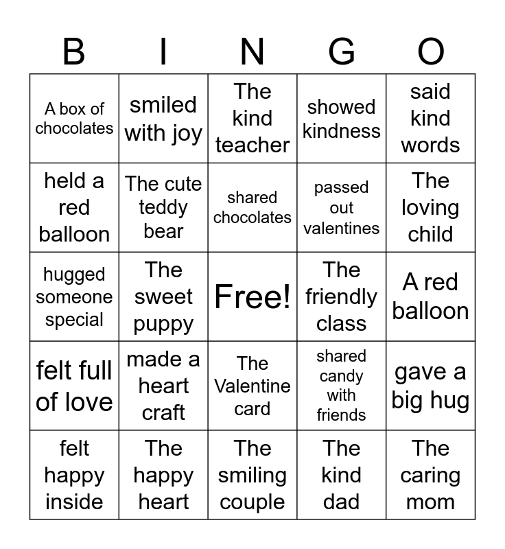 This bingo card has a free space and 30 words: The happy heart, My best friend, The sweet puppy, The loving family, A box of chocolates, The kind teacher, The cute teddy bear, The Valentine card, The friendly class, The smiling couple, A red balloon, The caring mom, The kind dad, The special gift, The loving child, gave a Valentine card, shared candy with friends, felt full of love, made a heart craft, said kind words, hugged someone special, wrote a sweet note, smiled with joy, passed out valentines, held a red balloon, showed kindness, gave a big hug, felt happy inside, shared chocolates and celebrated Valentine’s Day.